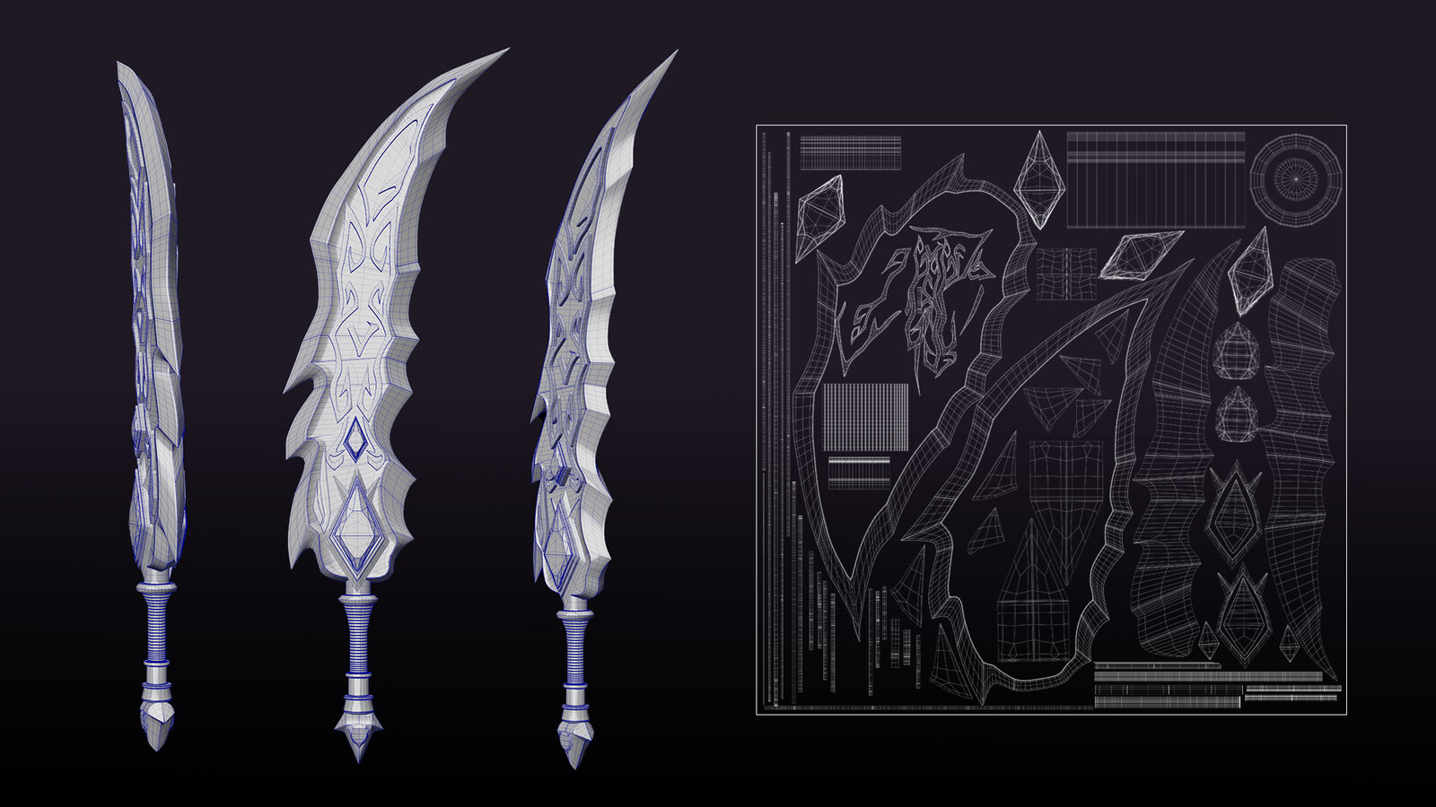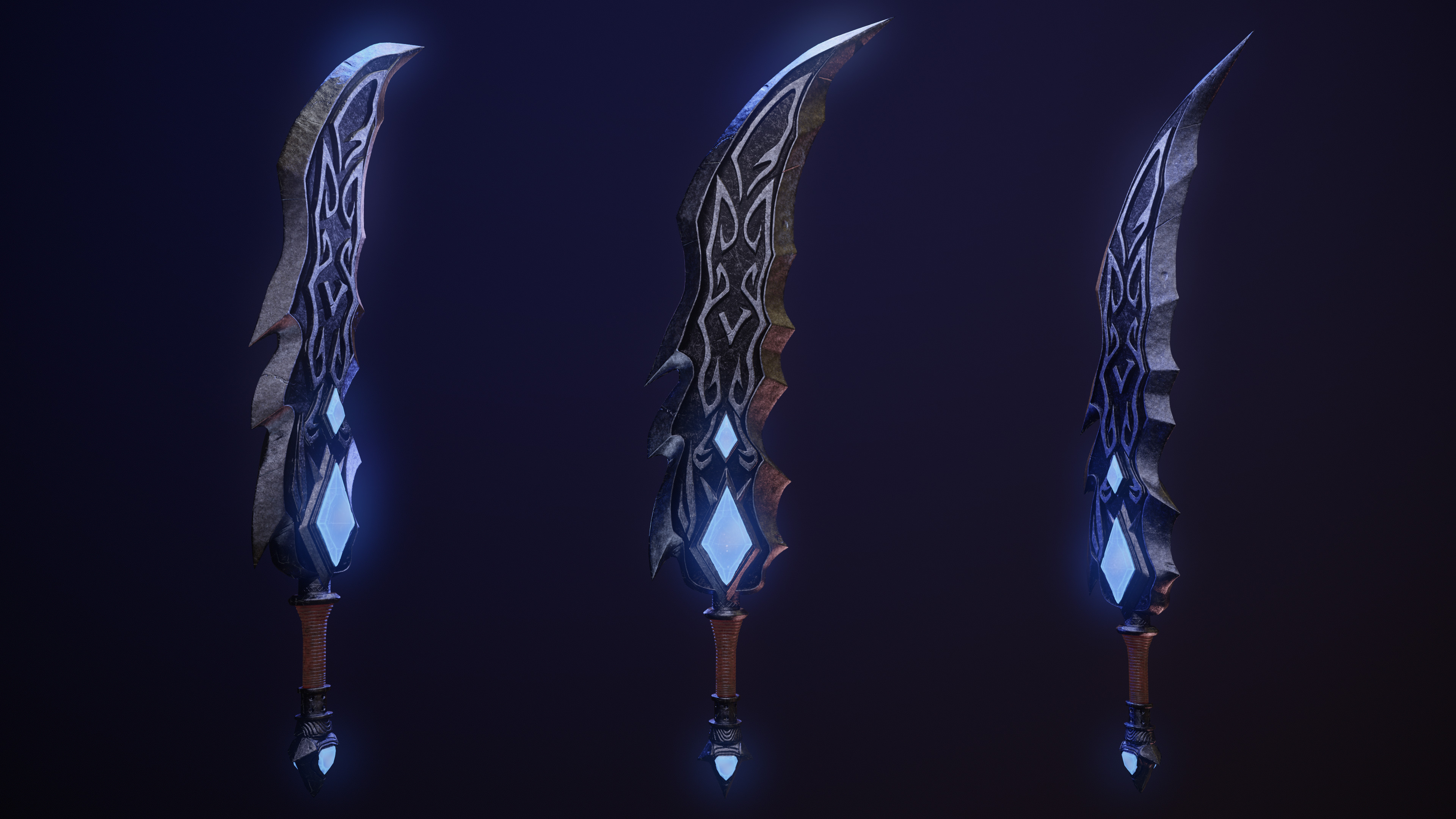 I wanted to design a powerful ice-themed blade with glowing runes and a magical crystal core. Inspired by the visual style of weapons seen in games like League of Legends, while developing an original design and material treatment.